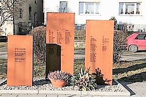 Drei steinerne Tafeln, davon zwei mit Namen der Gefallenen und Vermissten des Ersten Weltkriegs (rechts) und des Zweiten Weltkriegs (mittig) in einer kleinen Anlage unmittelbar neben der Dorfstraße.