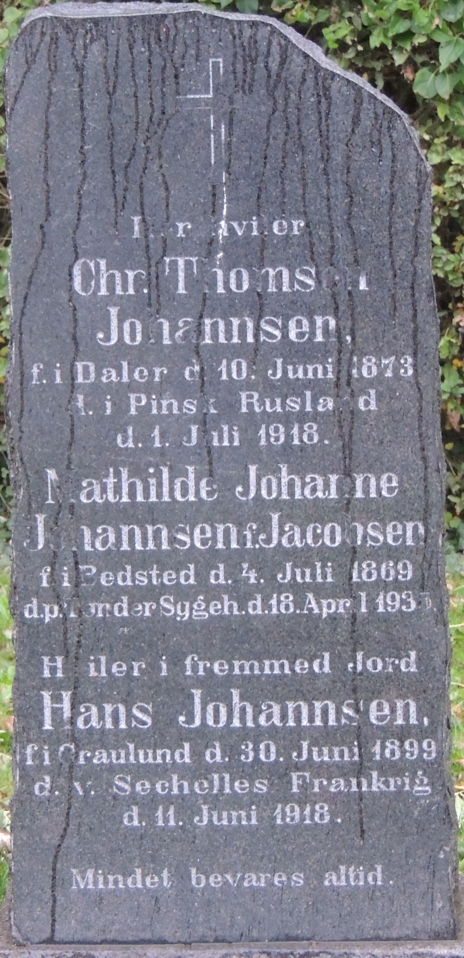 Angehörige: Mathilde Johanne Johannsen, geb. Jacobsen, * Bedsted 04.07.1869, + 18.04.1935