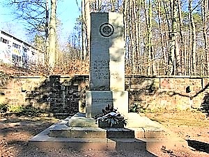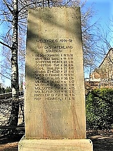 Ein Denkmal in der Nähe des Friedhofes neben der Turnhalle eines Sportvereins.