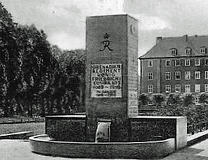 Rest-Inschrift heute: DER BRUNNEN IST VON CAROLINE VON MANSTEIN GEB. FREIIN VON PUTTKAMER GESTIFTET. DAS EHRENMAL IST VON ANGEHÖRIGEN DES GRENADIER REGIMENTS KÖNIG FRIEDRICH I - OSTPR. No 5 ERBAUT. 13.8.1933
