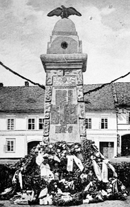 Denkmal für die Gefallenen des 1. Weltkriegs: Stele aus Natursteinblöcken mit eingelassener Widmungs- und Namenstafel. Darauf abgestufter Aufsatz mit krönendem Adler (abgerissen).