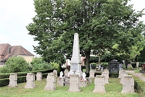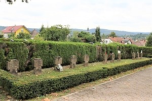 Im Friedhof an zwei Stellen Kriegsgräber; Erster Weltkrieg Steinkreuze im Quadrat, in der Mitte schlanke Säule; Zweiter Weltkrieg eine Reihe von Steinkreuzen an einer Hecke; zusätzlich Daten von privaten Gedenksteinen.