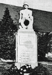 Denkmal für die Gefallenen des 1. Weltkrieg: Quader mit Widmung und Namen, darauf kniende Kriegerfigur mit Stahlhelm, Schwert und Ehrenkranz haltend (abgerissen).