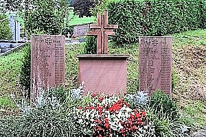 Im Friedhof drei Steintafeln, die mittlere mit Kreuz