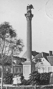 Denkmal für die Gefallenen des Krieges 1870/71: Quader mit eingelassenen Tafeln, darauf hohe klassische Säule mit krönendem Adler (abgerissen).