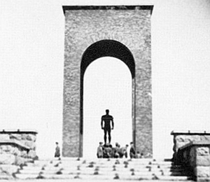 Denkmals-Anlage für die Gefallenen des 1. Weltkriegs: Torbogen mit Kriegerfigur. Inschriften an den Innenseiten des Denkmals (abgerissen).