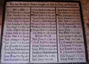 Denkmal für die Gefallenen des Ersten Weltkriegs. Natursteinmauer mit oben eingelassenem Eisernen Kreuz und an beiden Seiten Reliefs marschierender Soldaten. Mittelteil mit Namenstafel fast vollständig verwittert. Gedenktafeln in der Kirche. Familiengrab Wolfien. Gefallenenlisten in Ortschronik