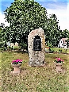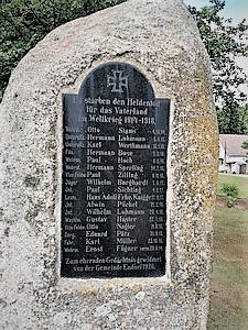 Kriegerdenkmal von 1920 auf dem Platz vor dem Gutseingang an der Hauptstraße. Auf dem Friedhof Gedenkstätte
