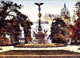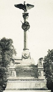 Denkmal für die Einigungskriege 1866 und 1870/71 am Hirschgarten. Abgestufter verzierter Quader mit Inschriftentafeln. Darauf Säule mit krönendem Adler. An der Säule befestigt waren Schild, Speer und Ehrenkranz. Am Sockel der Säule waren Plaketten von Heerführern angebracht und am Quader antike Kriegermotive.