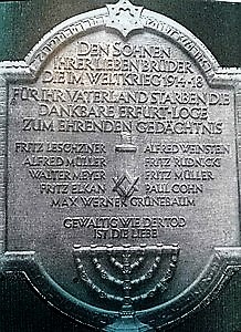 Den Söhnen ihrer lieben Brüder die im Weltkrieg 1914-18 für ihr Vaterland starben Die dankbare Erfurt-Loge zum ehrenden Gedächtnis (Namen) Gewaltig wie der Tod ist die Liebe.
