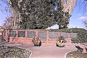 Im Friedhof; Gedenkplatten an der Friedhofsmauer