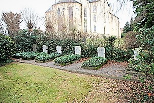 noch sechs Einzelgräber für Gefallene des 2. Weltkriegs und an der Kirchenwand eine Gedenktafel für drei