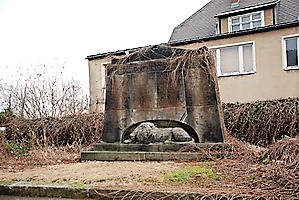 dunklem Stein. Unten das Relief eines schlafenden Löwen, darüber die Namen. In der Nähe befinden sich