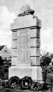 Denkmal für die Gefallenen des 1. Weltkriegs: Hohe Wand aus Steinblöcken mit Widmungs- und Namenstafel, sowie krönendem Stahlhelm und Ehrenkranz (abgerissen).