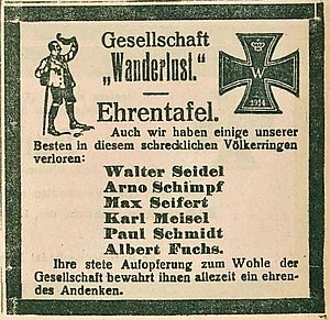 Falkenstein/Vogtl. (Wanderlust), Vogtlandkreis, SachsenPLZ 08223 Anzeige der Gesellschaft "Wanderlust" Falkenstein zu den gefallenen Mitgliedern der Gesellschaft im Falkensteiner Anzeiger.