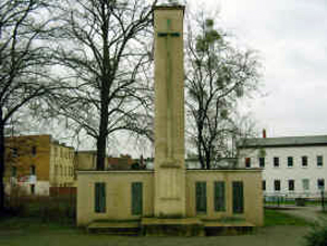 Denkmal für die Gefallenen des 1. Weltkriegs an der Schönebecker Straße: Hohe zentrale Säule mit Schwert-Motiv und Widmung. Niedrige Seitenflügel mit sechs Namenstafeln.