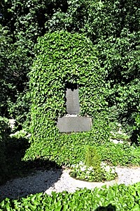 Kleine Anlage mit Gedenkstein, der fast völlig von Efeu überwachsen ist.