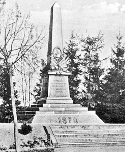 Denkmal für die Gefallenen des Krieges 1870/71: Abgestufter Obelisk mit Inschriften, Plakette mit Bildnis von Kaiser Wilhelm I. und Verzierungen in Form von Waffen.