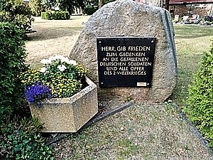 Freienhufen (Friedhof), Stadt Großräschen, Landkreis Oberspreewald-Lausitz, BrandenburgPLZ 01983 Mitten am Friedhof gesäumt durch Thujenhecken ein heller Steinblock mit einer aufgesetzten dunklen Steintafel, rechts unten im Eck eine Bronzeplatte.