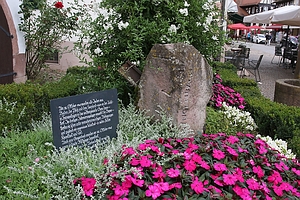 Ecke Victor-Kretz-Straße / Engelgasse; Gedenkstein mit durchgehender Eisenschiene und Stacheldraht herum sowie den Inschriften "Gengenbach" "Gurs", daneben eine Tafel