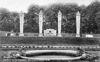Denkmal an der Hohenzollernstraße. Vier Stelen in einer Reihe, die nach unten verjüngt waren, sollten eine Geschützbatterie darstellen. In der Mitte ein Stein-Sarkophag mit einem EK-Zeichen und den Zahlen „1914-1918“. Auf den äußeren Stelen weitere unbekannte Inschriften. An den inneren Stelen Schwert-Motive.