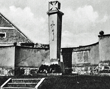 Für die Gefallenen des 1. Weltkriegs: eine halbrunde Mauer mit eingelassenen Namenstafeln, davor eine unten verjüngte Stele mit Schwert-Relief und krönendem EK-Zeichen (abgerissen).