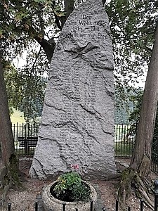 Denkmal-Nr.: 09234466 Es befindet sich gegenüber der Schulstr. 3. Von ortsgeschichtlichem Wert. Großer, aufrecht stehender, aus der Bosse geschlagener Naturstein (Granit). Einfriedung, Stahlzaun, schöne Altgehölze rahmten diese Gedenkstätte. Inschrift und Namen der Gefallenen nach Todesdatum geordnet in den Stein eingrafiert und schwarz gefärbt.