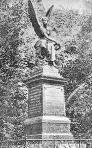 Denkmal für die Gefallenen des Krieges 1870/71: Abgestufte Stele mit Inschriften und krönender Figur einer sitzenden Siegesgöttin die einen Lorbeerkranz werfen will.