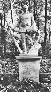 Denkmal für die Gefallenen des 1. Weltkriegs: Quader mit Inschrift, darauf Soldaten-Standbild mit Gewehr.