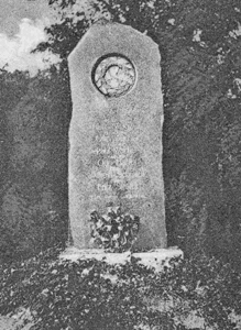 Denkmal für die Gefallenen des 1. Weltkriegs: Aufgerichtete Steinplatte auf einem kleinen Hügel. Im oberen Bereich ein EK-Zeichen im Ehrenkranz (abgerissen).