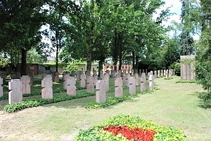 Auf dem Friedhof befindet sich eine Kriegsgräberstätte. Durch Steinkreuze geehrt sind hier begrabene Opfer des Zweiten Weltkriegs (auch einige des Ersten Weltkriegs). Zudem befindet sich hier das Denkmal für die örtlichen Gefallenen des Ersten Weltkriegs in Form eines ca. 2 m hohen Granitkubus.