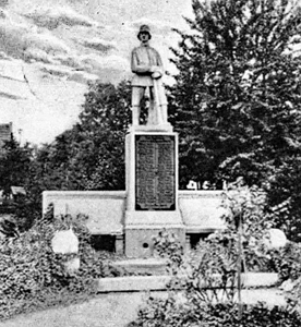 Denkmal für die Gefallenen des 1. Weltkriegs: Stele mit eingelassener Namens- und Widmungstafel, darauf Standbild eines Soldaten mit Stahlhelm und Gewehr. Daran Seitenflügel in Form von Steinbänken (abgerissen).