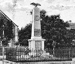 Denkmal für die Gefallenen des 1. Weltkriegs: Quader mit eingelassenen Namenstafeln, darauf Obelisk mit Widmungstafel und EK-Zeichen, gekrönt von einem Adler (abgerissen).