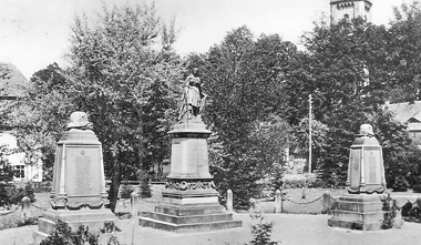 Ehemalige Denkmals-Anlage vor der Kirche: Denkmal für die Gefallenen des Krieges 1870/71: Abgestufte und verzierte Stele mit krönender Figur einer Germania mit Schwert und Schild.