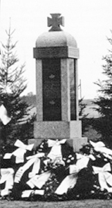 Denkmal für die Gefallenen des 1. Weltkriegs: Auf abgestuftem Sockel eine Stele mit eingelassenen Widmungs- und Namenstafeln, gekrönt von einem EK-Zeichen (abgerissen).