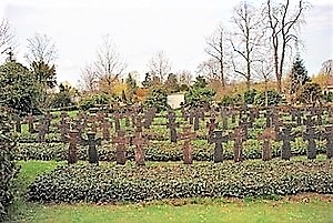 Im oberen Teil des städtischen Friedhofes befindet sich eine Kriegsgräberanlage. In einem Karree befinden sich über 100 braune Holzkreuze für Gefallene/Gestorbene des Zweiten Weltkriegs. Auf diesen befindet sich Name, Todesdatum und das Alter. Eine Reihe von Kreuzen zeigt nur den Familiennamen auf oder ist mit unbekannt (17 Stück) gekennzeichnet. An einer Begrenzungsseite steht zwischen Hecken eine ca. 4x2 m weiße Mauer mit Widmung. An den anderen drei Seiten befinden sich Einzelgräber verschiedenster Art. Zum Teil stehen dort die gleichen Holzkreuze, zum Teil Gräber mit diversen Grabsteinen für Gefallene des Ersten Weltkriegs, z.T. sind die Gräber ohne namentliche Kennzeichnung und zugewachsen. Um dieses Karree befindet sich ein Weg. Neben diesen steht noch eine Stele mit Widmung und drei braune Holzkreuze für (zivile) Opfer des Zweiten Weltkriegs. An anderer Stelle können noch zwei separate Einzelgedenken gefunden werden.