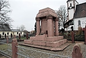Vor dem Friedhof steht ein schönes Denkmal aus rotem Stein. Auf einem Treppensockel steht ein quadratischer Stein,