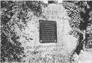 Denkmal-Nr. 09232129 Auf dem Kirchhof mit Einfriedung: Einfacher Findling mit Inschrift und Tafel für Großzöbern und Berglas, 1925 geweiht.