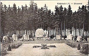 Denkmal-Nr.: 09246712 Anlage von ortshistorischer Bedeutung und hohem Erinnerungswert. Zentraler, großer, aufgerichteter Bruchstein, unbehauen (Porphyr), flankiert von zwei Buchen, im Halbkreis (ursprünglich Karree) aufgestellte sechs kleinere, aufrechtstehende Bruchsteine mit den eingemeißelten Namen der Gefallenen, alter Baumbestand. Ein von einem Bildhauer gestalteter nach links gewendeter Adlerkopf und mehrere große Gedenksteine, in die Namenslisten eingemeißelt sind, erinnern an die Toten des Ersten Weltkrieges aus Grünbach. Die Steine stehen um eine kleine Fläche, auf der ursprünglich ein Eisernes Kreuz als Pflanzung zu sehen war (Bilder 1 u. 2). Auf der Grundlage eines Beschlusses der Gemeindevertretung von 1968 begann eine Umgestaltung der Anlage, der Adler wurde entfernt und auf den Schutt geworfen, eine Blumenschale aufgestellt und bepflanzt. Nach der politischen Wende im November 1989 sah es plötzlich anders aus. 1995 wurde die Anlage saniert, die verblichenen Namen wurden wieder lesbar gemacht und die Blumenschale verschwand (Bild 3). 1997 wurde eine Glastafel am mittleren Gedenkstein für die Gefallenen im Zweiten Weltkrieg angebracht, die 1999 zerstört wurde. Im Jahre 2008 konnten Dank zahlreicher Spenden neue Tafeln für die Gefallenen des Zweiten Weltkrieges geweiht werden (Bild 4). 2013 kam der wieder gefundene und restaurierte Gedenkstein von Krieg 1870/71 dazu (Bild 5).