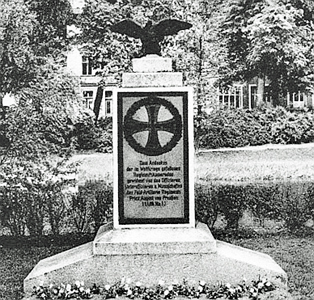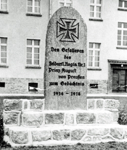 Denkmäler für die Gefallenen des Feldartillerie-Regiment "Prinz August von Preußen" (1. Litauisches) Nr. 1: Sockel mit Seitenflügeln. Darauf Quader mit Inschriften und großem umrandeten EK-Zeichen, gekrönt von einem Adler. Dreistufiger Natursteinsockel mit aufgesetzter Steinplatte. Darauf Widmung und großes EK-Zeichen oben.
