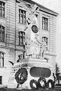 Reich verziertes Denkmal für die Gefallenen des Krieges 1870/71: Quader aus Steinblöcken mit eingelassener Metalltafel. Darauf zwei Figuren eines Soldaten und eines Schmiedes und ein Obelisk mit EK-Zeichen, eine Plakette der Kaiser Wilhelm I. und Friedrich III., Kaiserkrone und krönendem Adler (abgerissen).
