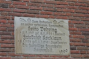 Sandsteintafel in Gebäudefassade Zum Andenken an unsere gefallenen Kameraden (Namen). Die freiwillige Feuerwehr Harpenfeld 1969.