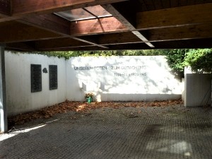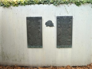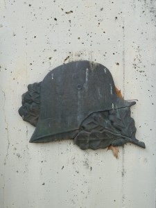Weißgetünchte Mauer unmittelbar bei der Aussegnungshalle auf dem örtlichen Friedhof. Inschrift, zwei Metalltafeln und zwischen den Tafeln die Darstellung eines Stahlhelms mit einem Eichenzweig.