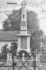 Denkmal für die Gefallenen des 1. Weltkriegs: Abgestufter Obelisk. Unten eingelassene Namenstafeln. Oben Inschriften und christliches Kreuz, gekrönt von einem EK-Zeichen (abgerissen).