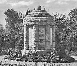 Denkmal für die Gefallenen des 1. Weltkriegs: Auf einem zweistufigen Sockel ein rundes Denkmal mit acht Säulen und dazwischen Felder mit Widmungen und Namen. Darauf sechsstufiges Dach mit krönender Kugel (abgerissen).
