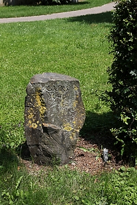 PLZ 78247 Der Memorialstein ist ein niedriger Stein. Er steht im Schlosspark Hilzingen. Die Inschrift Gurs 1940 ist an der Vorderseite eingemeisselt, darüber ein Davidstern.