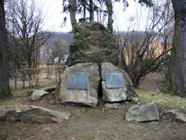 Kleine Parkanlage mit großem unbearbeitetem Naturstein an dem zwei kleine ebenfalls unbearbeitete Natursteine mit jeweils einer gusseisernen Tafel lehnen.