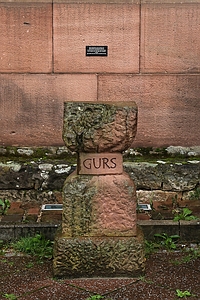 Stein bei der ev. Friedenskirche; niedriger Stein in der Mitte schmäler - wie mit einem Gürtel abgeschnürt - und dem Schriftzug «Gurs»; dahinter an der Kirchenmauer Info-Plakette.