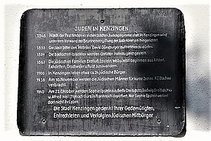 JUDEN IN KENZINGEN 1848 Nach der Pest finden in vielen Städten Judenpogrome statt. In Kenzingen wird unter dem Vorwand der Brunnenvergiftung der Jude Abraham hingerichtet. 1853 Die Stadt bittet den «Hebräer» David Günzburger aufnehmen zu dürfen. 1809 Die badischen Israeliten werden Christen nahezu gleichgestellt. 1862 Die jüdische Familien Dreifuß, Epstein, Weil u. Wolf beginnen aus Altdorf, Eichstetten, Orschweier u. Rust zuzuwandern. 1900 In Kenzingen leben etwa ca. 24 jüdische Bürger. 1938 Am 10. November werden die jüdischen Männer für kurze Zeit ins KZ Dachau verbracht. 1940 Am 22. Oktober werden Sophie Epstein (68), Berta Dreifuß (70), Ludwig Dreifuß (74) u. Alfred Weil (59) nach Gurs in Frankreich deportiert. Nur Sophie Epstein verliert dort nicht ihr Leben. Die Stadt Kenzingen gedenkt ihrer Gedemütigten, Entrechteten und Verfolgten Jüdischen Mitbürger
