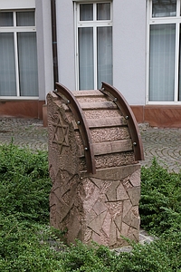 Der Memorialstein, ein Stein mit oben abgerundetem Teil auf dem Schienen angebracht sind. Seitlich sind der Davidstern und die Gesetzesrollen als Relief zu sehen sowie eine Plakette. Der Stein steht an der Poststrasse vor der ehemaligen Synagoge.